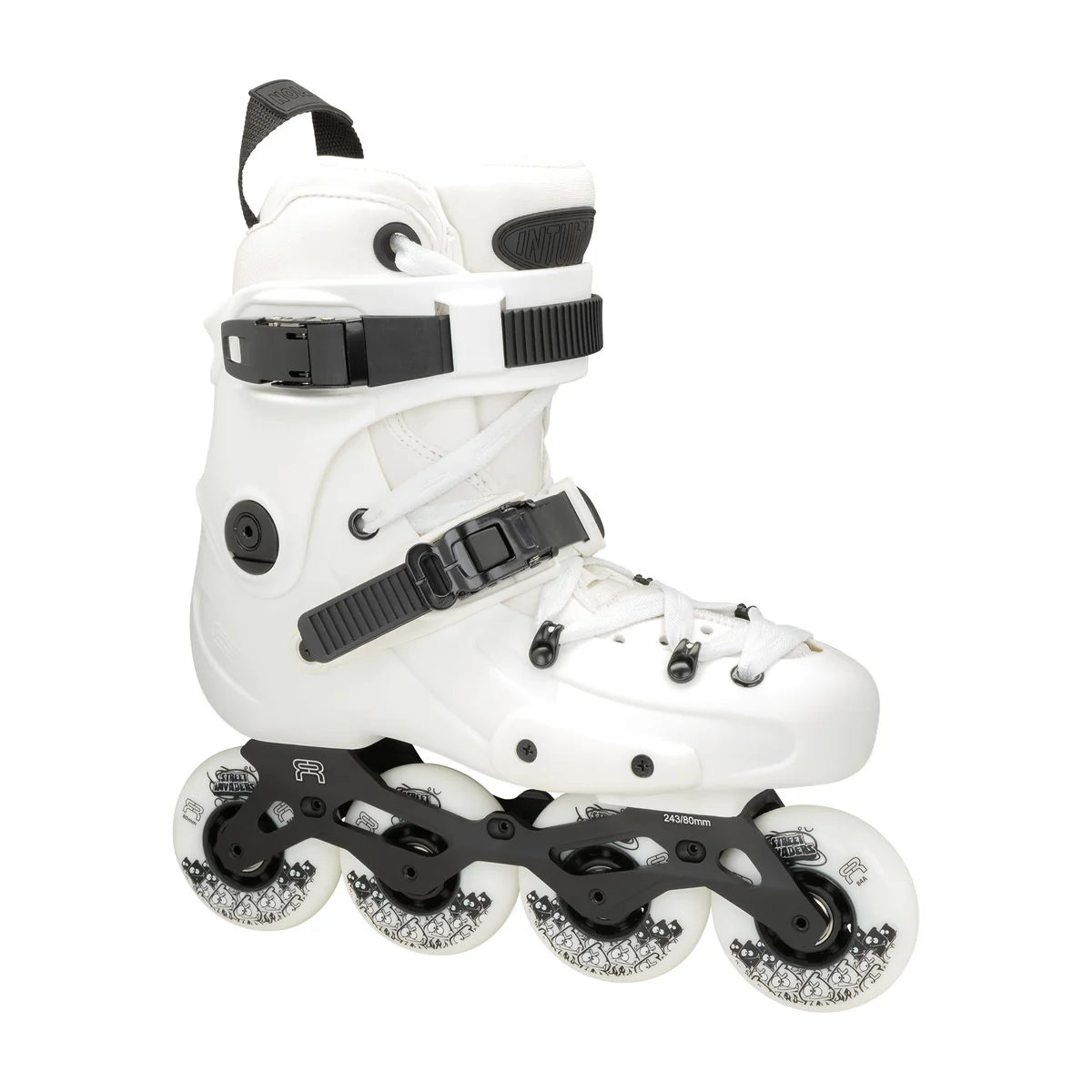 - Street Invader Wheels – 80mm/84A: White wheels for optimal grip and control in urban environments.